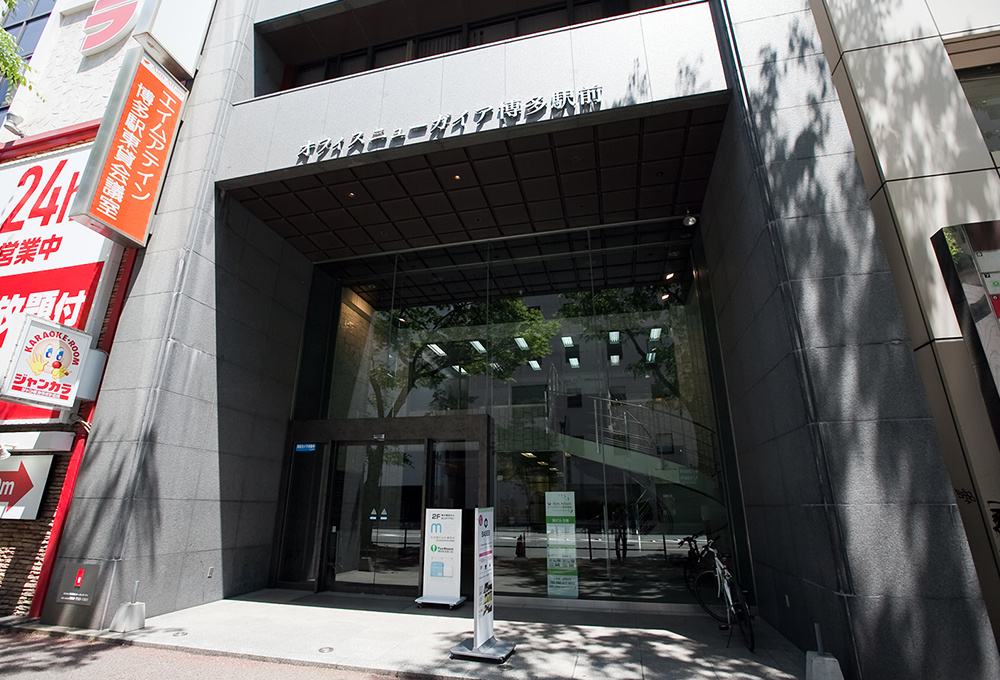 博多駅筑紫口を出て大通り(筑紫口通り)を渡り、カラオケのジャンカラさんとトヨタレンタカーさんの間の濃いグレーのビルです。